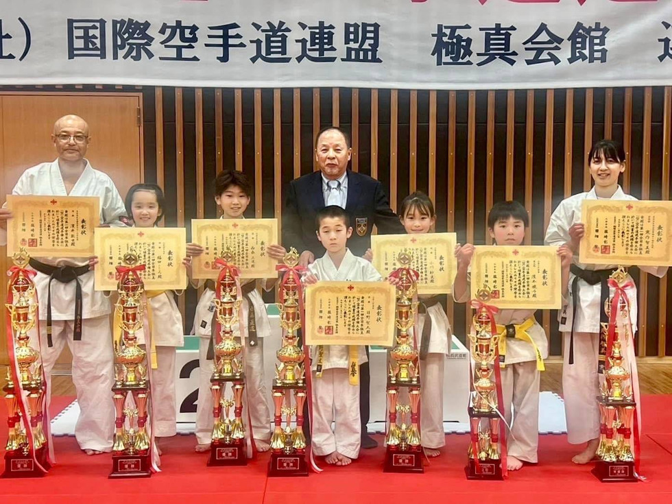 令和7年1月18日(土) 横浜市で開催された、第1回全日本極真「型」大会に、三津支部から10人の選手が出場。 小学6年男子の部で西森正道くん、小学5年女子の部で小川紗良さん、小学4年女子の部で福田こころさんが、それぞれ優勝、小学2年混合で濱本稜斗くんが3位に入賞しました。